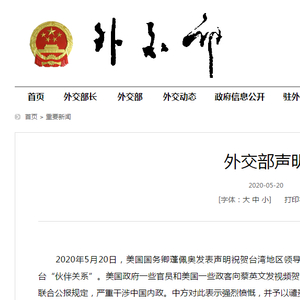 2020年5月20日,美国国务卿蓬佩奥发表声明祝贺台湾地区领导人蔡英文就职,将其称为所谓“总统”,并吹嘘美台“伙伴关系”。美国政府一些官员和美国一些政客向蔡英文发视频贺辞。美方上述举动严重违反一个中国原则和中美三个联合公报规定,严重干涉中国内政。中方对此表示强烈愤慨,并予以谴责。
