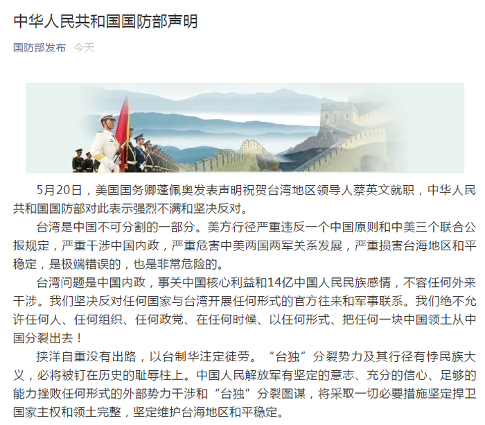 5月20日,美国国务卿蓬佩奥发表声明祝贺台湾地区领导人蔡英文就职,中华人民共和国国防部对此表示强烈不满和坚决反对。