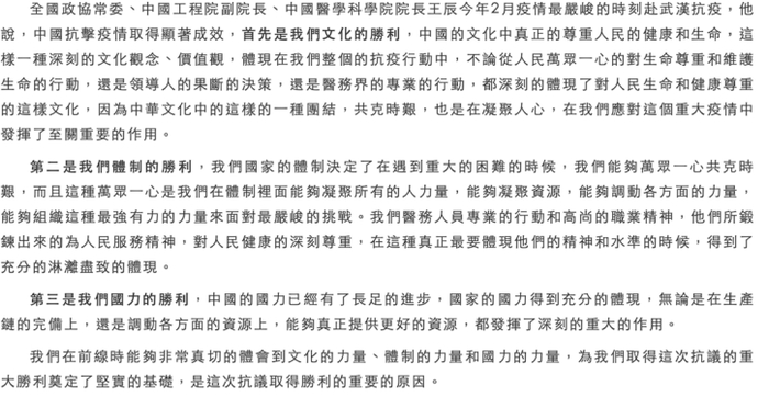 《文汇报》专门开辟“2020全国两会”专版,聚焦会议最新资讯和动态。其中首先关注“王辰委员:抗疫胜利是中国文化的胜利”。报道援引曾赴武汉抗疫的全国政协常委、中国工程院副院长、中国医学科学院院长王辰的话,指出:我们在前线时,能够非常真切的体会到文化的力量、体制的力量和国力的力量,为我们取得这次抗疫的重大胜利奠定了坚实的基础,是这次抗疫取得胜利的重要的原因。