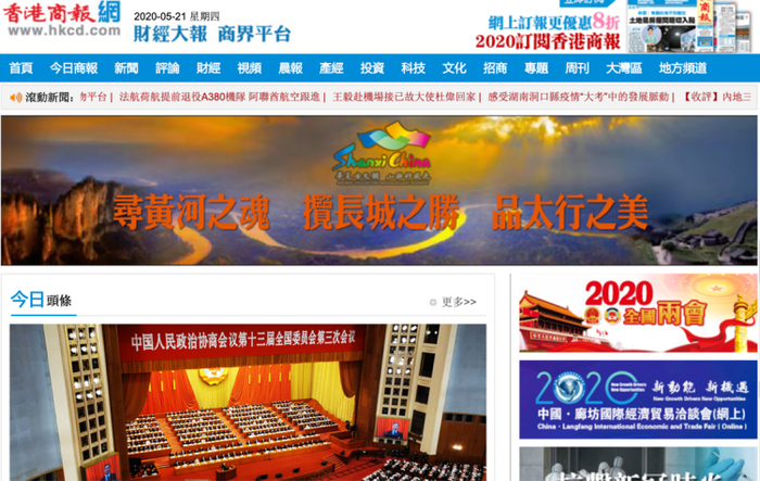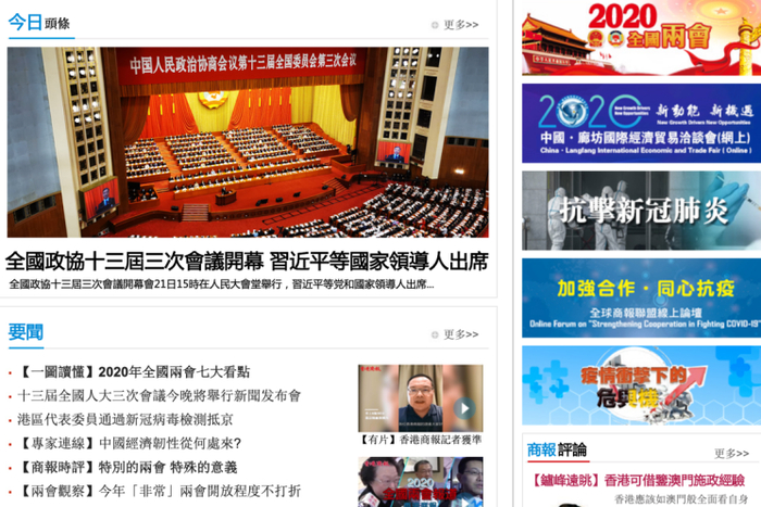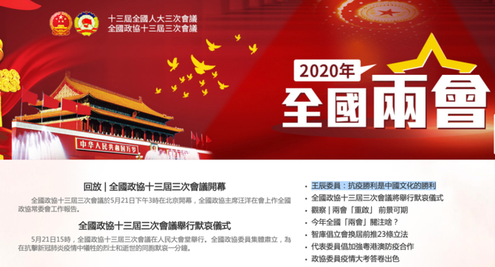 《香港商报》在其官网今日头条的位置重点关注:全国政协十三届三次会议开幕的消息,并特别设计了“一图读懂”“两会观察”“专家连线”等两会专栏,深度解读会议的重要资讯和透露的信息。