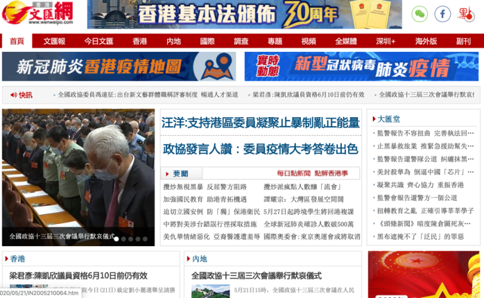 其中,香港《文汇报》在版面头条位置,重点关注两会期间的涉港重要资讯“汪洋:支持港区委员凝聚止暴制乱正能量”。报道援引了全国政协主席汪洋代表政协第十三届全国委员会常务委员会作工作报告的重要内容,指出要紧紧围绕推动“一国两制”行稳致远,强化港澳委员政治责任和使命担当,坚定支持完善特别行政区同宪法和基本法实施相关的制度和机制。