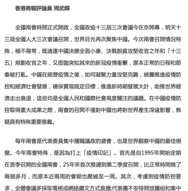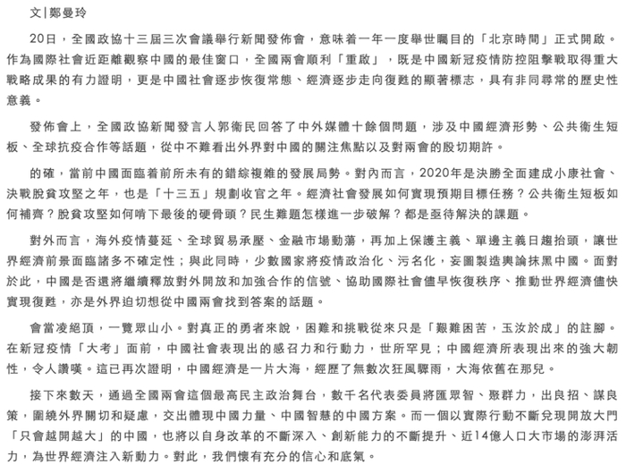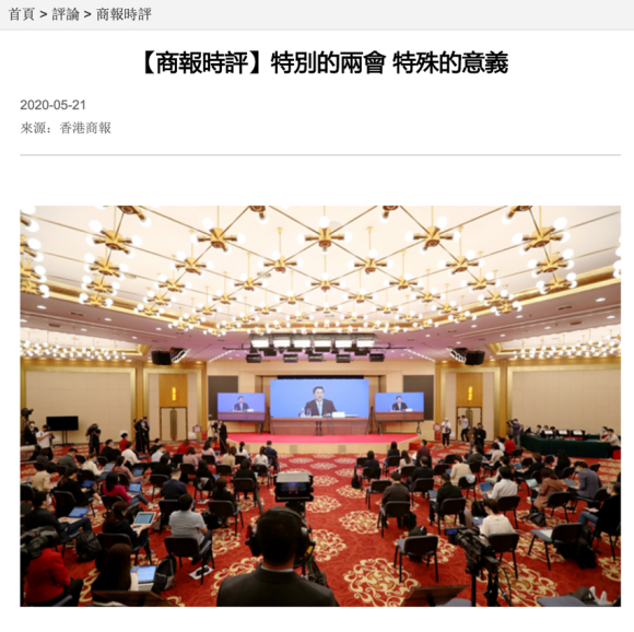 值得注意的是,《香港商报》还特别发表题为“特别的两会 特殊的意义”的商报时评,指出:中国在经历疫情之后,如何凝聚力量攻坚克难,统筹推进疫情防控和经济社会发展,确保实现既定目标,推进新时期发展大计,助推世界经济走出衰退,这些均是全国人民和国际社会高度关注的议题。在中国疫情防控取得重大成果之际,两会的召开,不仅对中国也将对世界产生深远影响,无疑具有特殊重要意义。