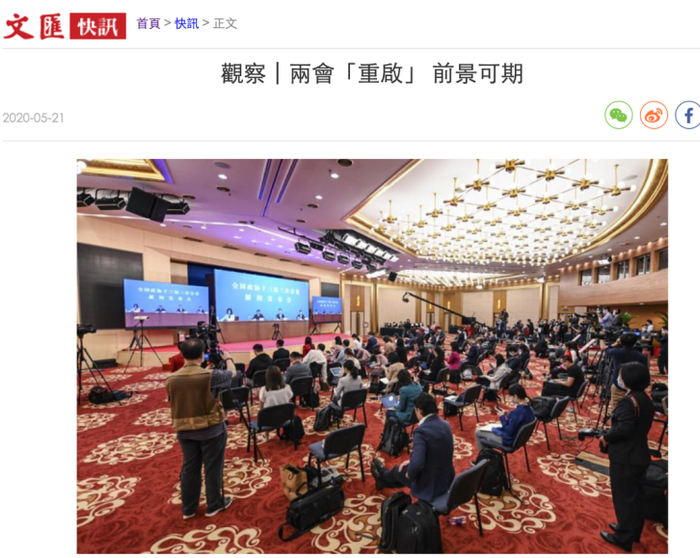 《文汇报》还在重要位置,发表题为“两会‘重启’前景可期”的记者观察,指出:作为国际社会近距离观察中国的最佳窗口,全国两会顺利“重启”,既是中国新冠疫情防控阻击战取得重大战略成果的有力证明,更是中国社会逐步恢复常态、经济逐步走向复苏的显著标志,具有非同寻常的历史性意义。观察报道在最后还特别指出:通过全国两会这个最高民主政治舞台,数千名代表委员将汇众智、聚群力,出良招、谋良策,围绕外界关切和疑虑,交出体现中国力量、中国智慧的中国方案。而一个以实际行动不断兑现开放大门“只会越开越大”的中国,也将以自身改革的不断深入、创新能力的不断提升、近14亿人口大市场的澎湃活力,为世界经济注入新动力。