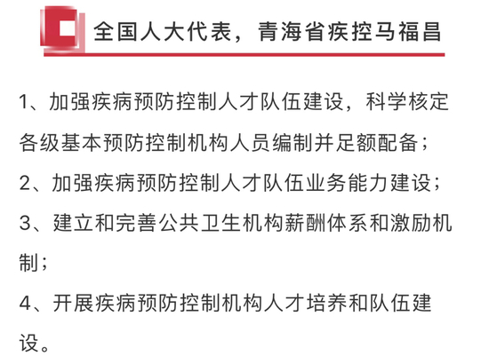第二,疾控中心人员的稳定参照广东省对公共卫生这块的改革,把疾控纳入公务员的管理,它从工资待遇还有职业发展方面能够有所提高,希望能够先兑现,一步一步再走。