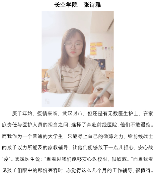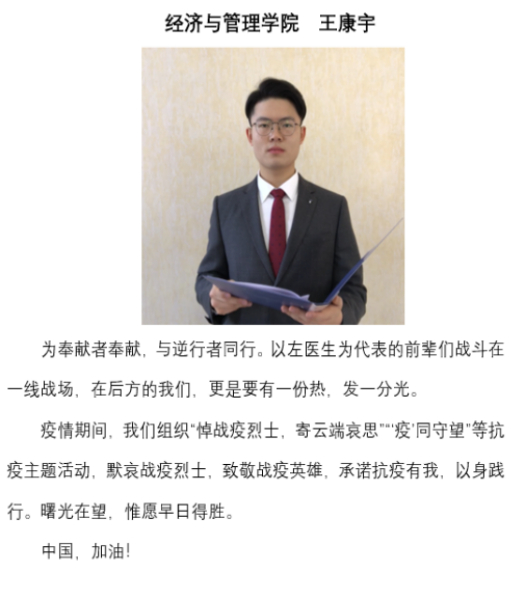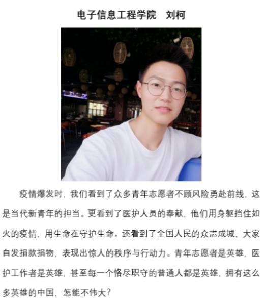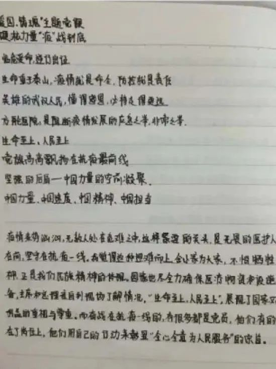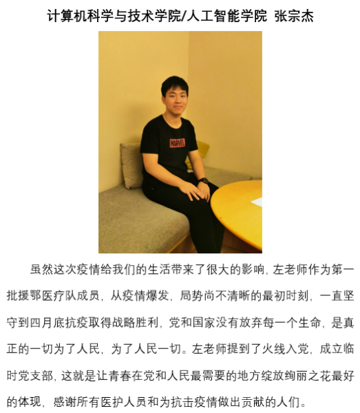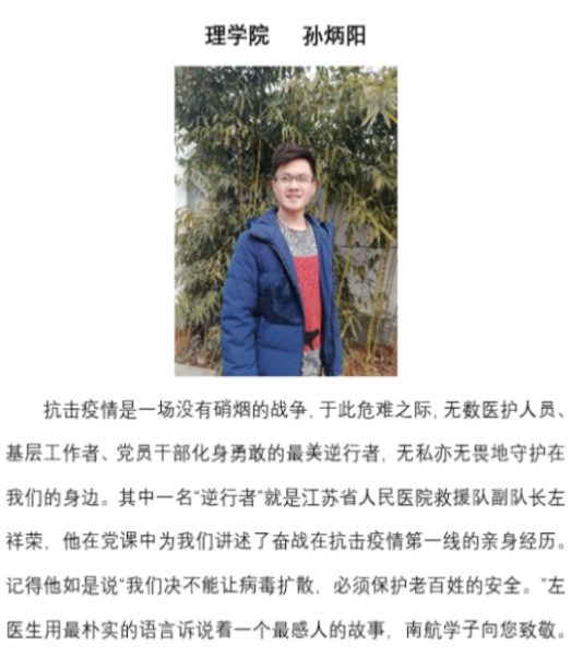 A2:全国4.2万医护人员驰援湖北,江苏就有2820名,10天建成可容纳1000张床位的火神山医院、13天建成可容纳1500张床位的雷神山医院。一周之内改建了16所方舱医院,可容纳1.2万张床位…这一个个数字,充分展示了中国特色社会主义制度优势,让我们看到了中国共产党以人民群众的生命安全和身体健康放在第一位的情怀。同学们疫情已经基本过去,我们的抗疫战争已经取得了战略性的胜利。相信你们每个人都经受了一场身心的洗礼,对爱、责任和担当有了更深的认识和思考。我们身处伟大的时代,参与实现中华民族伟大复兴的历史征程,每个人的命运都和国家民族时代紧密相连,我们每个青年人都要不负党的期望,人民的期望,民族重托,用创造的双手去书写国家的未来。