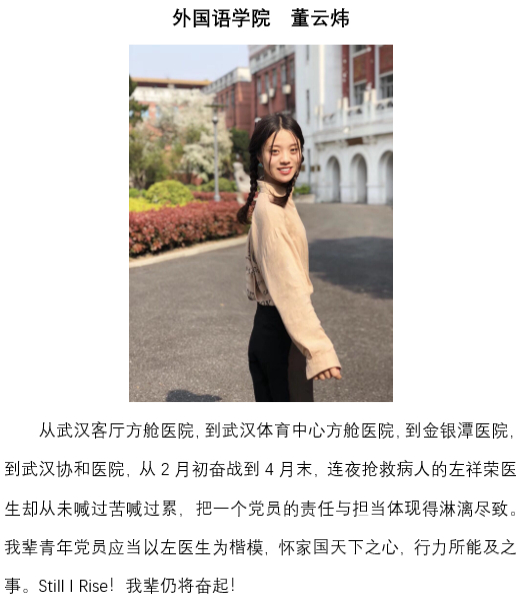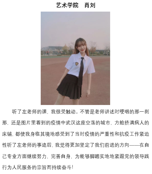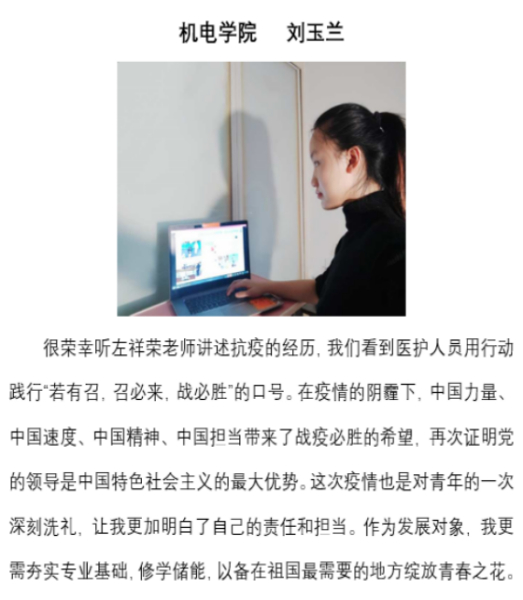 战“疫”期间,我校学生党员响应中央号召,在学校部署下积极参与社区防控、为战“疫”医护人员子女开展志愿家教,在实践中发挥先锋模范作用。党课现场,各学院党员代表录制的致敬“最美逆行者”视频获得师生阵阵掌声。