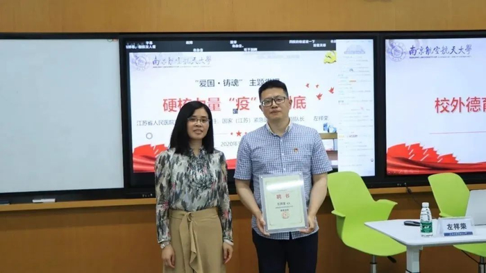 党课开始前,党委组织部副部长庞小燕为左祥荣主任颁发聘书,聘请左祥荣为“南京航空航天大学校外德育导师”。