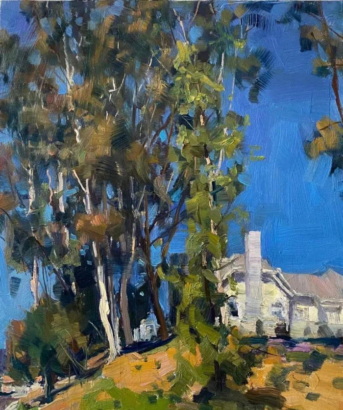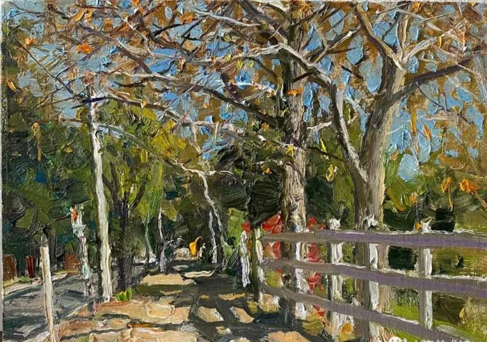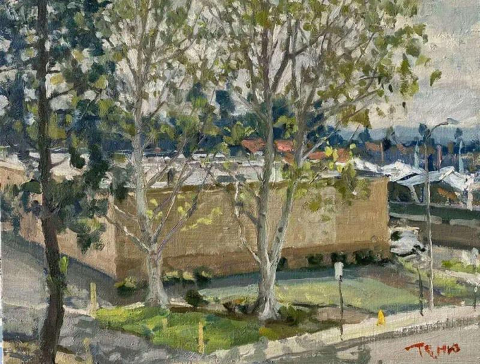 在王铁牛这次满怀深情创作《大庆石油会战》之前,沈阳九方禾谷艺术馆和大连美术馆分别举办了他的旅美油画写生展。他向记者解释,这些油画是他今年冬春时节在美国创作的。突如其来的疫情,打乱了按部就班的节奏,放慢的脚步,又多了描绘美好的时间。他在美国抗击疫情期间,描绘了一段疫情下的风景,形成个性化的“疫情日记”。