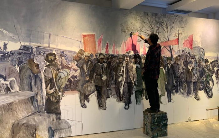 王铁牛正在创作《大庆石油会战》。