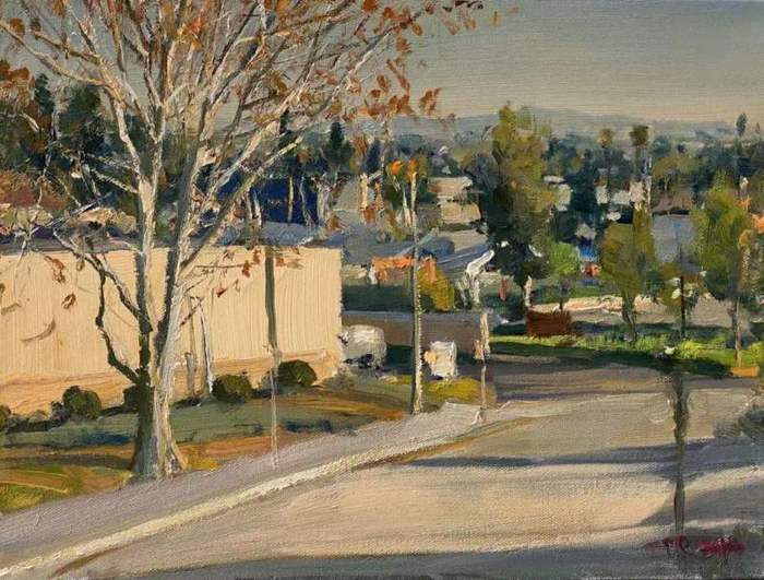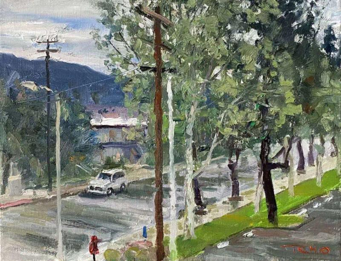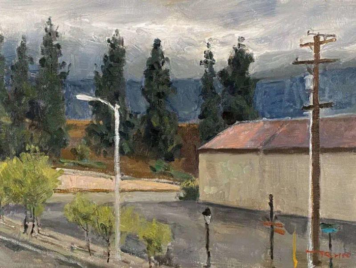 在美国抗击疫情期间,他宅在洛杉矶寓所里,每天面对的是同一处街景。虽然街景是不变的,但是晨昏交割的时光还是一如既往地变换着。在这不断变化的日光中,让他得以在光线的变化中对造型、色彩的规律性进行体验和探索,画出了一批疫情下的洛杉矶风景。他还驱车5000公里,走访美国西部七个州,一边观察疫情下的美国人民生活,一边欣赏大自然的美丽景色,有条件现场写生时就打开画板,没有机会和时间就把美景先“画”在头脑里、储存在手机中。他思考着如何发挥油画的造型语言,去强化那些震撼心灵的现场感受,调动色彩的力量,调度构图的节奏与动感,用笔触的表现力,直接传递着画面的情绪韵律,以求诗化的整体视觉效果。