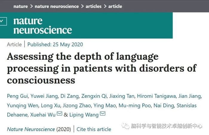 2020年5月25日,中国科学院脑科学与智能技术卓越创新中心(神经科学研究所)、中国科学院灵长类神经生物学重点实验室王立平研究组与复旦大学附属华山医院神经外科毛颖/吴雪海团队在《自然-神经科学》期刊在线发表了题为《探索意识障碍患者层级语言加工》的合作研究论文。