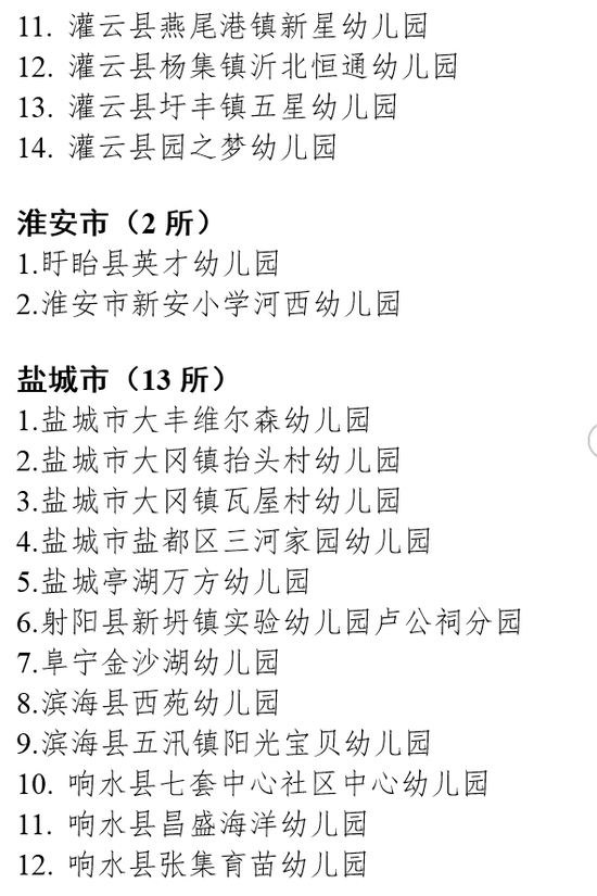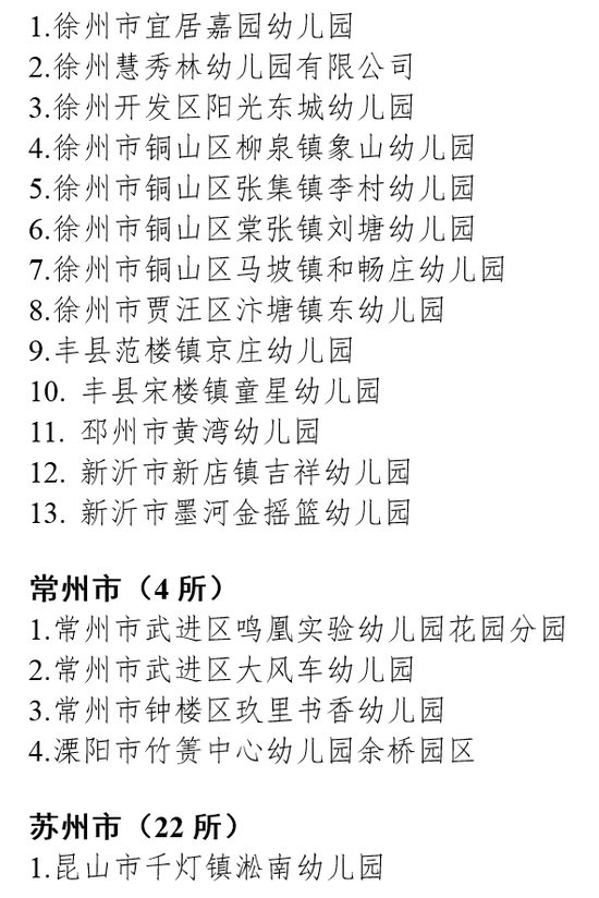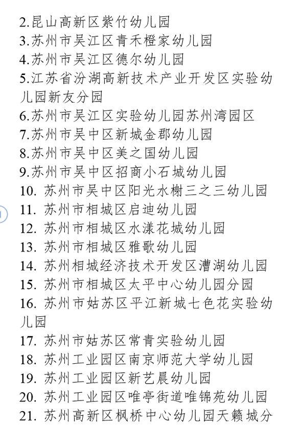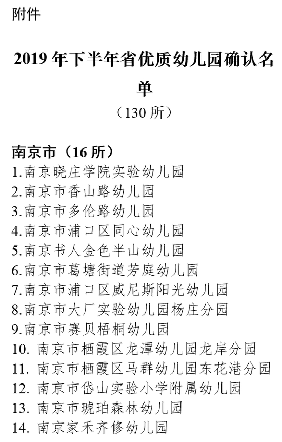 2019年下半年,全省共有243所幼儿园申报省优质幼儿园评估。经省教育评估院组织评估、省教育厅审核,确认南京晓庄学院实验幼儿园等130所幼儿园为“江苏省优质幼儿园”(具体名单见附件)。