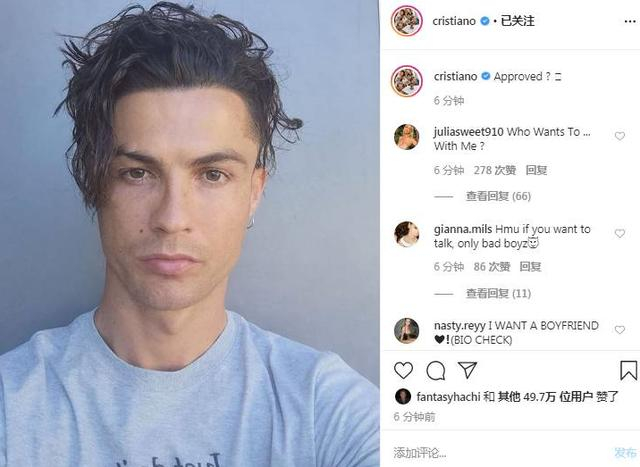新京报讯(记者 邓涵予)今日,C罗在个人社交媒体晒出了一张新发型的自拍,并向网友抛出灵魂拷问“Approved?”(还行吗?)。这条动态一经发出就让评论区炸开了锅,仅仅6分钟便收到近50万个赞。