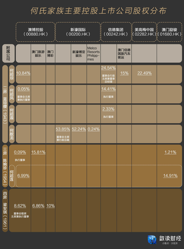 如今二太太次女何超凤接任澳博控股主席兼执董职务,掌管着赌王庞大资产中最为核心的产业。四太太梁安琪持有澳博控股8.62%的股份,远超二房长女何超凤和三太太陈婉珍。