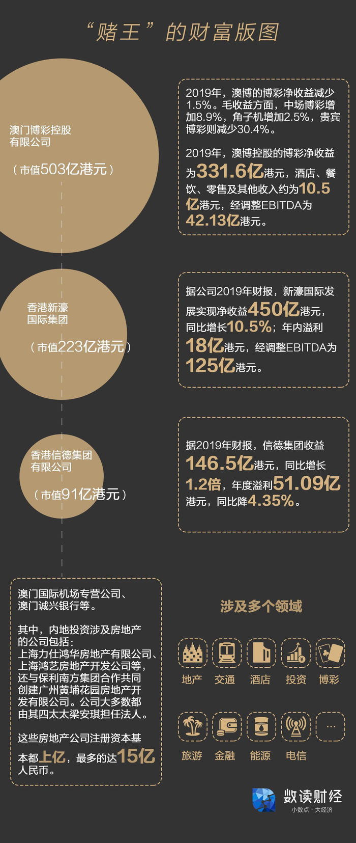 除了核心的三家上市公司澳博控股、新濠国际、信德集团外,何鸿燊旗下还拥有澳门国际机场专营公司、王牌国际等多家企业。业务版图涉及地产、交通运输、酒店、投资、博彩、旅游、金融、能源、电信等。