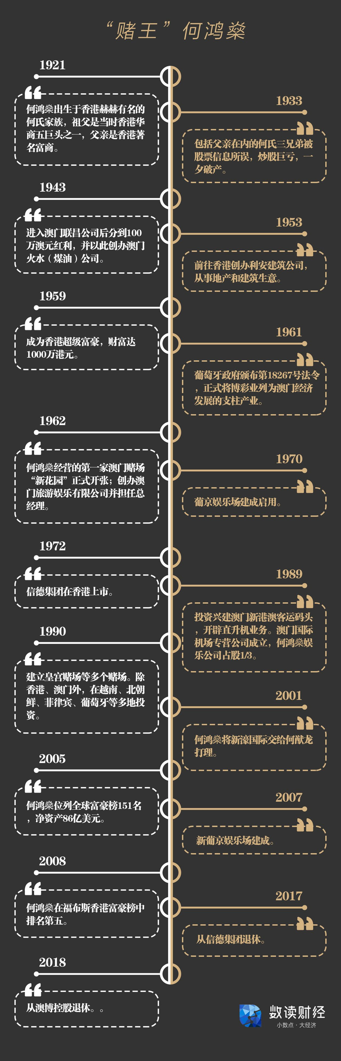 后来包括父亲在内的何氏三兄弟被股票信息所误,炒股巨亏,一夕破产。何鸿燊开始自食其力,凭一己之力,白手起家成就风云人生。