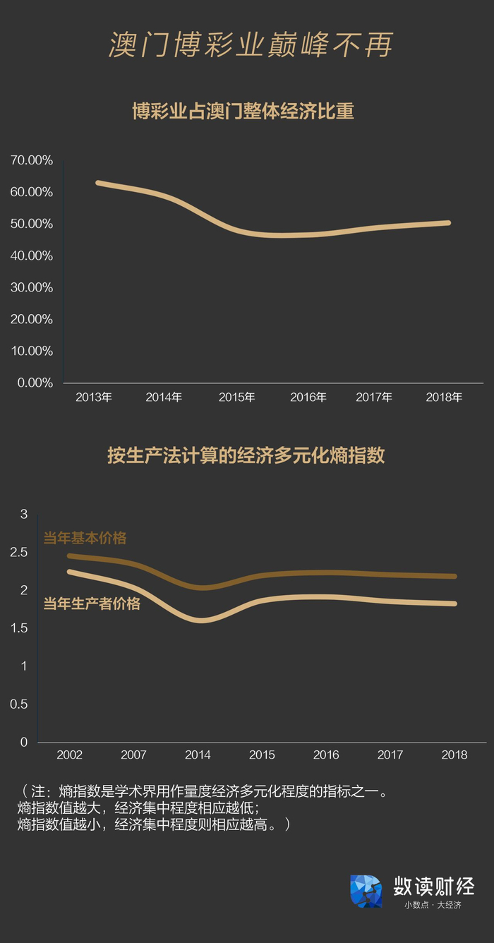 2019年12月13日,澳门特区政府公布2018年度《澳门经济适度多元发展统计指标体系分析报告》显示,博彩业在澳门整体经济比重由2013年的63.1%降至2018年的50.5%。