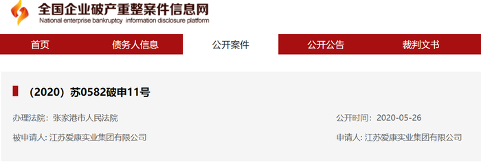 5月27日,新京报记者自全国企业破产重整案件信息网获悉,江苏爱康实业集团有限公司(下称“爱康集团”)作为被申请人出现,申请人同为爱康集团,办理法院为张家港市人民法院,公开时间为5月26日。
