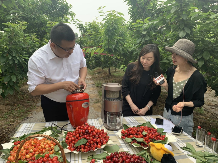 在直播现场,北京苏宁易购大区总经理郝嘉、家乐福华北区副总裁舒华也受邀来到樱桃基地,化身主播向网友送出食材净化器、破壁机、垃圾处理器等多个福利。