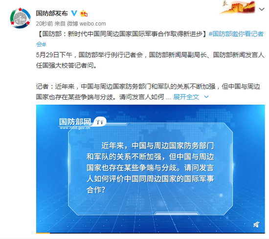 国防部:新时代中国同周边国家国际军事合作取得新进步