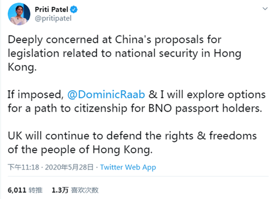 英国内政大臣帕特尔也立马在推特上联动上了,说正和拉布探索为BNO护照持有者提供更多权利的方法,包括延伸他们的“公民身份”之路。