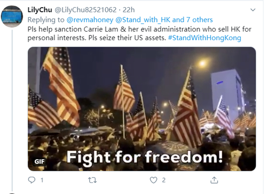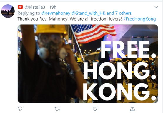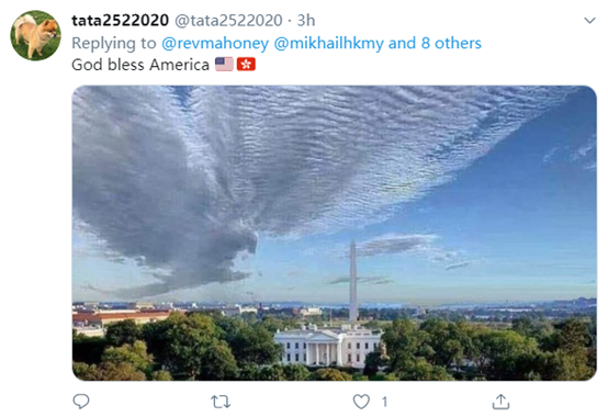 推特上其他亲美的乱港分子也同样吃相难看。比如,一个支持特朗普的美国牧师发布了一段支持乱港分子的贴文,大量乱港分子在回复中表示感谢,还有人贴出含有美国国旗的图片,以示对美国的感激。