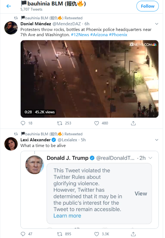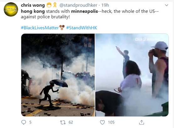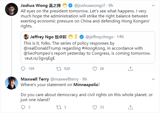 比如,乱港分子头目之一、与美国共和党关系亲密的黄之锋,就没有在推特上发表过任何关于美国 “反警察暴力”游行的内容。他发布的推特贴文,除了污蔑香港警察的内容,就是希望特朗普能帮他们对中国继续施压。