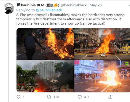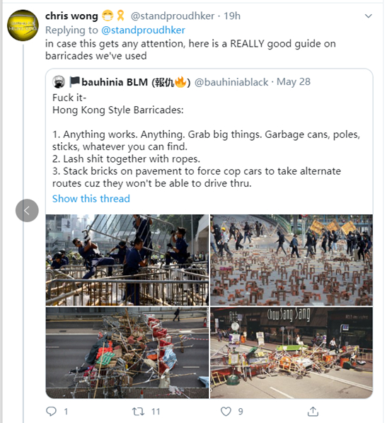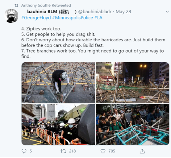 下图这两个乱港分子的推特,就表示他们会明尼阿波利斯的暴力示威者站在一起,还会将香港街头暴力抗法的做法都传授给他们。