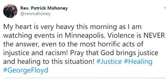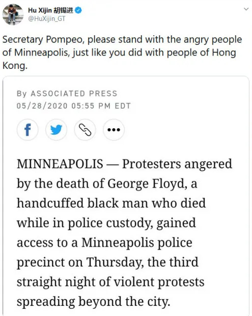 “请和明尼阿波利斯市这些愤怒的人们站在一起,一如你当时所说‘和香港民众站在一起’。”