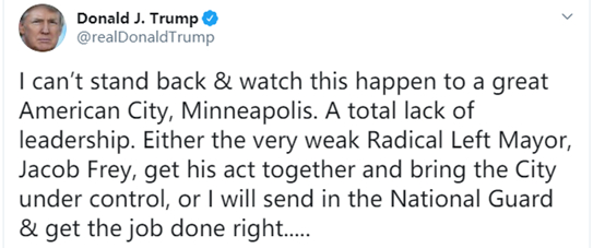 可讽刺的是,特朗普却表示要对明尼阿波利斯的抗议者 “出兵”,他明确表示:要派“国民警卫队”铲除“暴徒”,还威胁要对“暴徒”开枪。