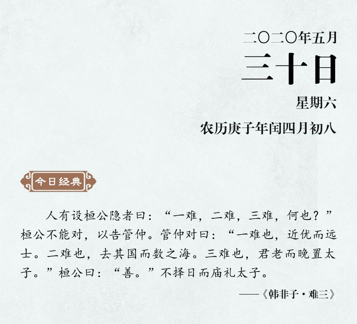 韩非的解释是:“物之所谓难者,必借人成势而勿使侵害己,可谓一难也。贵妾不使二后,二难也。爱孽不使危正適,专听一臣而不敢偶君,此则可谓三难也”。管仲将“难”解释为祸乱,韩非则解释为困难。国君治国的难处就是明确区分君臣、后妾、嫡庶地位的尊卑贵贱,只有确立明确的法律制度,并且严格执行赏罚,才能杜绝以下犯上的情况,只有这样,国君之位才能从根本上得到稳固。(阿阳)