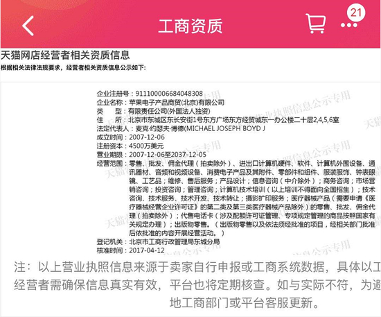 天猫官网显示,苹果的官方旗舰店开店时间为2013年12月10日,其经营方为苹果电子产品商贸(北京)有限公司。工商资料显示,该公司为外国法人独资企业,由Apple Operations International Limited全资持有。京东和苏宁官网显示,苹果的“自营旗舰店”经营方为苹果授权经销商。