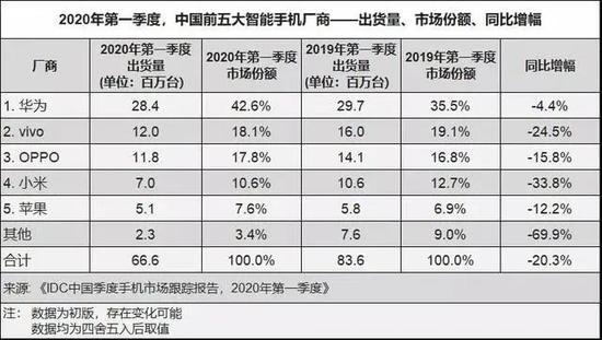 IDC数据显示,一季度中国智能手机市场出货量约6660万部,同比下降20.3%。其中,苹果出货量为510万部,同比下滑12.2%。