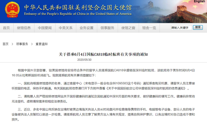 [海外网5月30日综合报道]中国驻美利坚合众国大使馆网站5月30日发布消息称,根据中国外交部部署,中国驻美国使馆将安排符合条件的留学人员搭乘国航CA818华盛顿至深圳临时航班,该航班将于美东时间6月4日16:05从杜勒斯国际机场起飞。现就搭乘航班有关事项提醒如下: