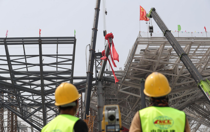 5月30日上午10点半,星火站最后一根钢梁精准落位。摄影/新京报记者 王贵彬