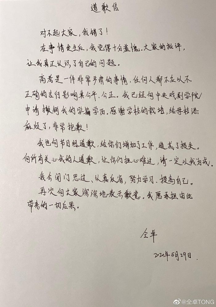 仝卓终于道歉了,不得不说,这是明智的选择。此前,仝卓自曝“往届生改应届生”遭质疑之后,一度感到很委屈,称“应届生”是自己考学失利后复读时的自我暗示,“我看着像不善良的人吗?”“当艺人好难,说话不自由。”