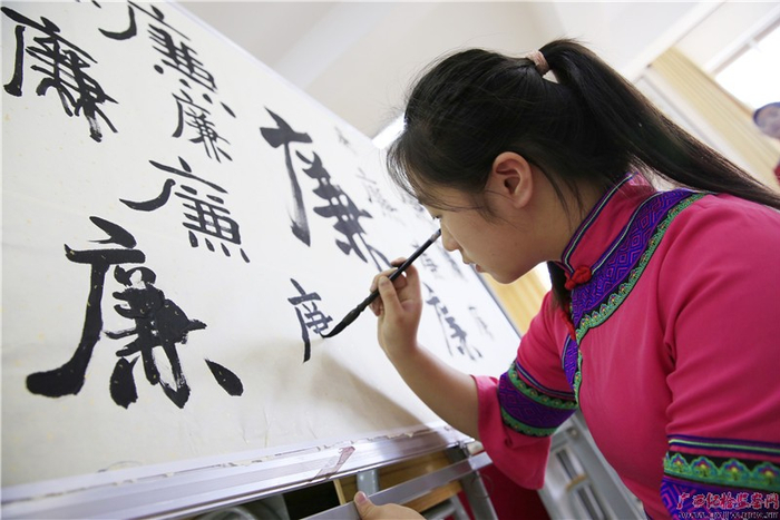 环江毛南族自治县第二小学的覃宇媛正在书写“廉”字,一点一横一竖间,极像了端端正正、清清白白的做人准则。