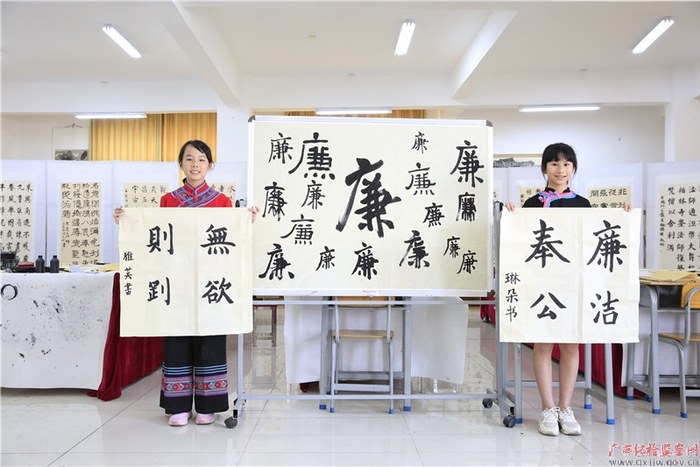 环江毛南族自治县第二小学学生展示“廉”字,通过书写“廉”字,感受廉洁魅力。