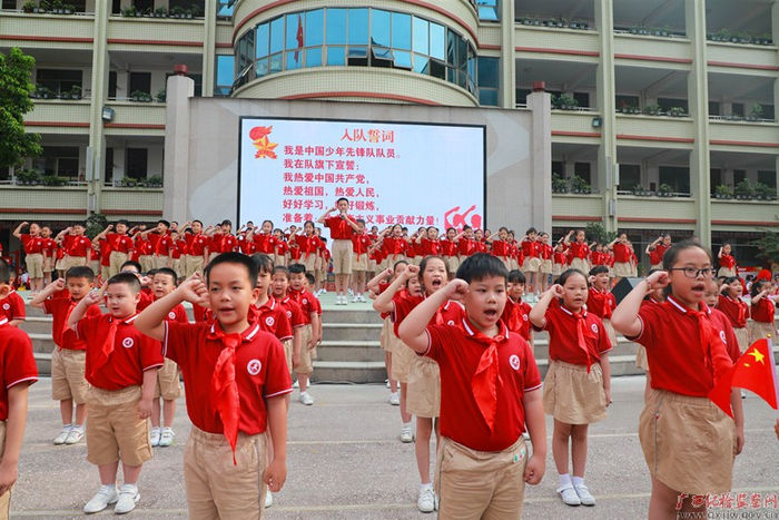 河池市金城江区实验小学一批朝气蓬勃的少年,带上鲜艳的红领巾,举起右手面向队旗宣誓,成为了光荣的少先队员,他们脸上充满了笑容、眼中充满希望。