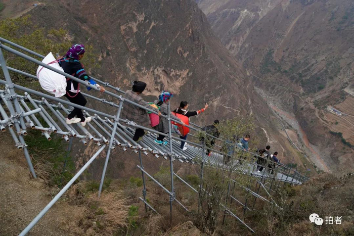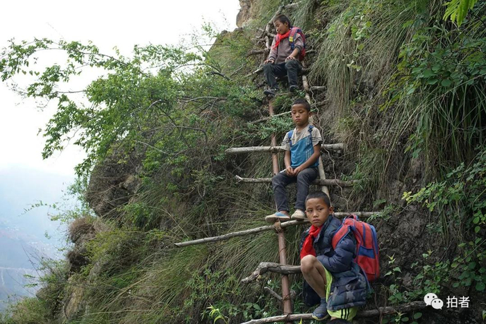 △2016年5月14日,在3位家长的保护下,15名孩子从山下的勒尔小学出发,踏上放学回家的路。他们要顺着垂直的悬崖攀爬17条藤梯,才能抵达比山下学校垂直高度超过800多米的“悬崖村”。