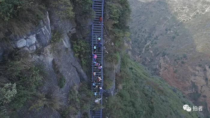 △2016年11月19日,孩子们攀登最后两段垂直高度一百多米的钢梯,过去的藤梯几乎和崖壁平行,现在的钢梯倾斜角度在60度左右,行走方便很多,也安全多了。