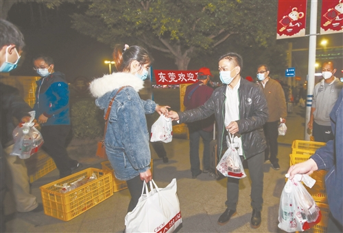 ■务工人员返莞复工,东莞人社部门推出贴心服务。图为我市相关工作人员为刚下火车的务工人员送上早餐 记者 郑家雄 摄