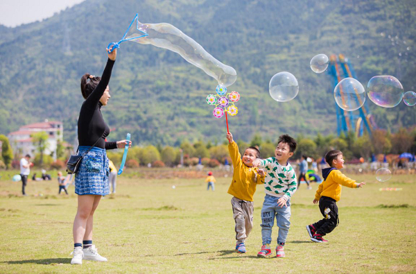 在六一儿童节到来之际,铜仁万山区的风筝基地充满了儿童们的欢声笑语。图为一家长带着孩子正在玩泡泡,阵阵银铃般的笑声回荡在碧草如茵的草地上。(铜仁市万山区纪委监委供 彭俊 摄)