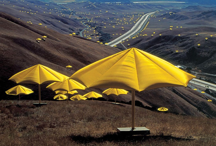 1985年-1991年,他们又耗资2600万美元 打造了“日本——美国——伞狂想曲”,在日本东京北面80英里的山坡和美国南加州的田野上,分别插上了1340把蓝色和1760把黄色的伞,这些高6米、直径8.66米的巨伞在山坡田野上绵延达12英里,蔚为壮观,在日本和美国两地引起了极大的轰动。