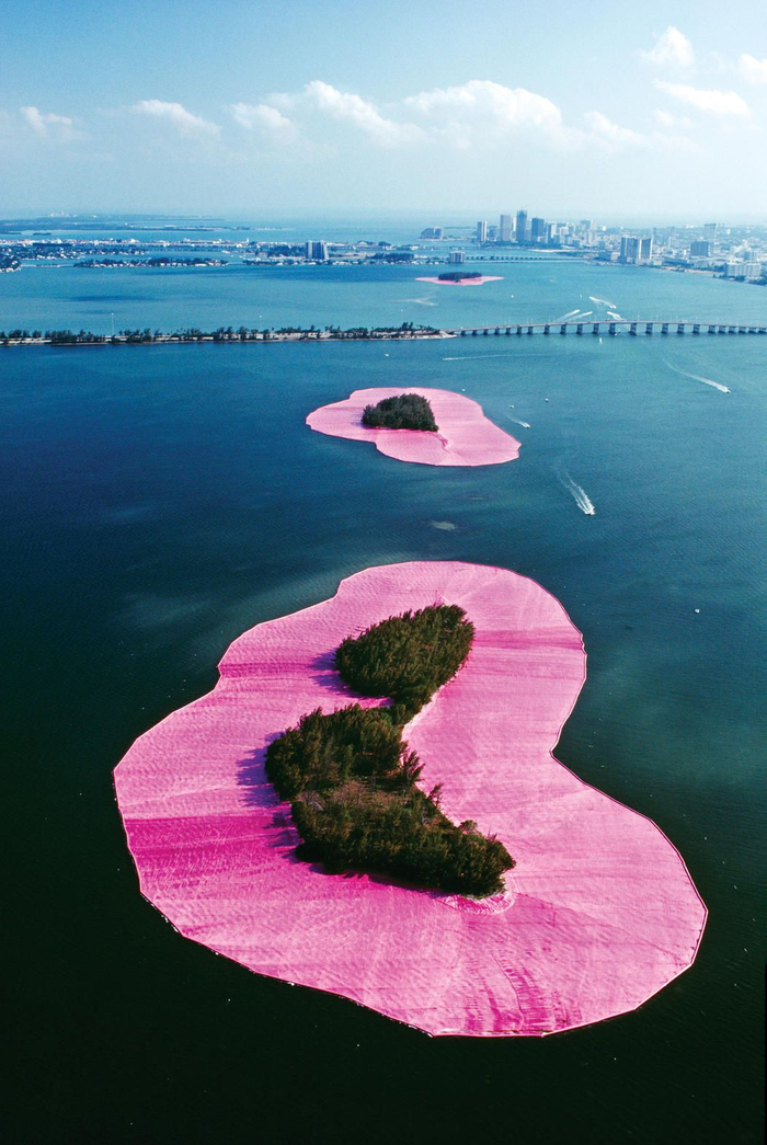 1980年-1983年“被环绕的群岛” 是他们受法国印象派画家莫奈的油画《睡莲》的启发,用超过 60万平方米的粉红色布料,覆盖佛罗里达的11座岛屿,从高空俯瞰,犹如漂浮在碧海上的11朵睡莲,成为奇景。
