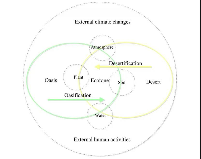 我国西北地区的绿洲化和荒漠化是两个反向发展又相互博弈的过程。中科院寒旱所学者张克存等2017年的研究发现,我国西北干旱区绿洲化、荒漠化的过快发展会侵占原本的两者过渡区域,进一步加剧生态系统不稳定性。为了研究绿洲-荒漠生态系统的生态维护、社会经济可持续发展等问题,中国科学院也建设起了中国生态系统研究网络(CNEN),旨在对绿洲-荒漠生态系统的大气、水文、植被、土地等要素进行长期连续观测。