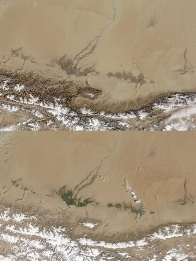 我们再说回上面的新闻,为什么塔克拉玛干沙漠2月到4月会发生“沙漠变绿洲”的“奇迹”呢?因为卫星监测的区域本来就是塔克拉玛干沙漠最主要的河谷绿洲之一。“奇迹”发生最主要的原因还是由于季节变化。春夏时节,高山融雪,河水丰盈,河谷绿洲的大片农田繁茂生长;而到了秋冬时节,河流几近干涸,卫星监测到的自然也就是一片荒芜的景象。因此该新闻很大程度上依然是一个“标题党”,不过这也不完全是国内媒体的锅,标题是从NASA新闻原标题 Greening in the Taklamakan Desert 直译过来的,NASA的本意是想表达即使在中国最干最热的沙漠,植物也会在春天焕发生机,但到我们中国这儿大家理解的又是另一个意思了。