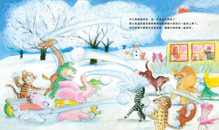 绘本中有浪漫的想象,绘本中有美丽的憧憬,在安德烈。德昂的绘本当中你总是能看到最瑰丽的梦幻世界,而他也总是以最温柔的方式告诉我们,这个世界上没有什么不可能的事情。猫和鱼可以是朋友,被丢掉的小熊也一样可以找到珍爱它的伙伴,有时候我们难免对人生失望,我们抱怨为什么等不到那份属于我们的礼物,可或许并不是上帝没有准备,之所以让我们等那么久,或许只是上帝在为我们打蝴蝶结而已。只要想,只要相信,这个世界永远充满了各种可能。