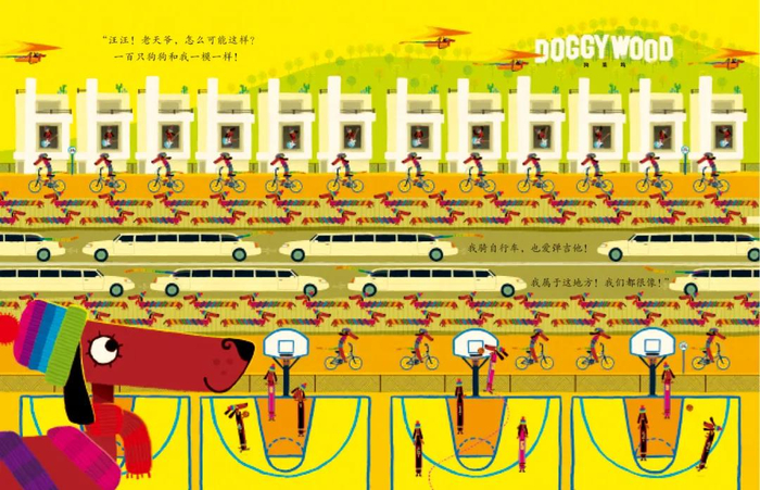 他说:中国的小朋友们,我给你们讲一个关于一只与众不同的腊肠狗狗的故事吧。她生活在一个满是腊肠狗的世界,但她与众不同,于是她开始离家远行,想找到一个可以融入的地方。然而,你猜,在远行的路上她意识到什么?她意识到,她不需要跟别的狗狗一样,做独一无二的自己才是最重要的。然后,其他的腊肠狗也意识到了这一点。看!每只狗狗都在做自己。所以,我想教你们画这只腊肠狗,也叫小达克斯猎犬。当你们画完的时候,非常重要的一件事情是署上自己的名字,这样大家就知道是谁创作的了。也许有人会画跟我一样的腊肠狗,也许有人会画各种各样的腊肠狗,他们都用不同的姿态摆着自己的尾巴,做着不同的事情,这正是这本书所要讲的。