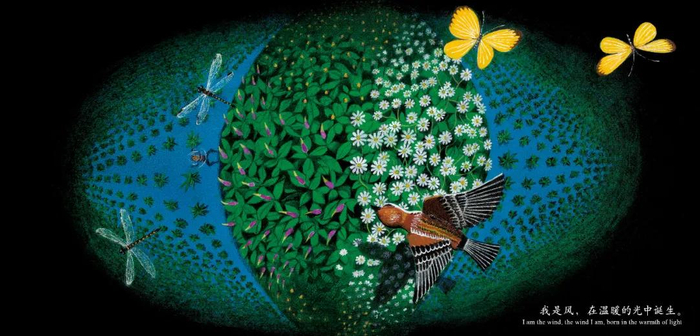 他说:我们的地球是宇宙中非常不可思议的星球,大自然充满能量,像风、引力,都是肉眼看不到的能量。我们作为人类、作为生物,就生活在这样的星球上。太阳从东边升起,一直到西边落下,一整天都在,所以我在绘本《和太阳在一起》里画了长长的影子,从左页一直到右页。在《风的旅行》里,通过风的眼睛来看我们的星球,飞越陆地、海洋、山峰,自由自在地旅行中国的小朋友们,现在是一个非常困难时期,想必大家也都待在家里。家里也可以玩捉迷藏,或者把看不见的风、平时不在意的太阳等等,通过绘画来表现。肉眼看不到的风该怎么画呢,通过观察,云朵变了形状,旗子飘动的样子,能感受到到风是真的存在的啊。挑战一下,画一画这些肉眼看不到的东西。这个主题或许有点困难,大家挑战画一下吧,祝大家平安健康。